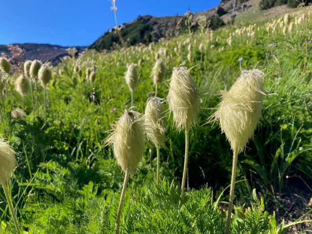 I always hear them but never see them. I’m determined to spot one this time. It beeps again, this time closer. Then I see it! A little creature with big ears is scurrying across the rocks in front of me, carrying something green in its mouth. A tiny pika salad! It beeps again, then skitters across the trail and up the slope. It beeps, then another pika beeps in the valley below. They go back and forth for a minute. What are they talking about? Arguing? Warning about the hikers? Inviting one another to a pika party tonight? Who knows.
