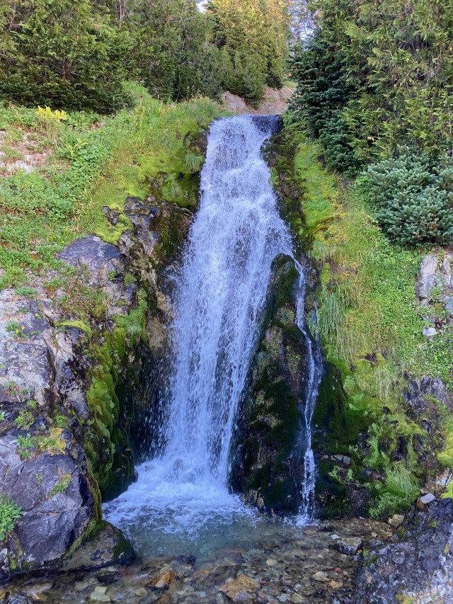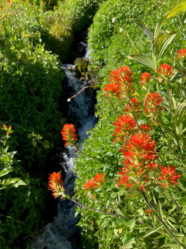 We walk almost in a trance through this wonderland. Everywhere I look, it’s more and more wonderful. There’s a patch of red paintbrush growing in the spray from a cold creek. Here’s a twenty foot tall waterfall that the trail crosses right past. A huge cliff makes its way down to a valley so far below. Trees cast huge shadows on perfectly green grass.