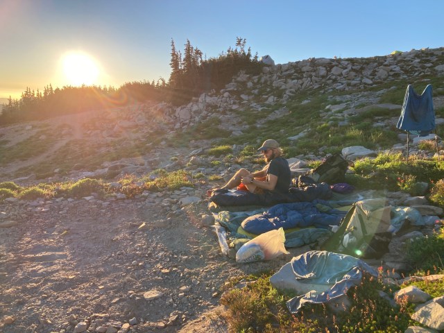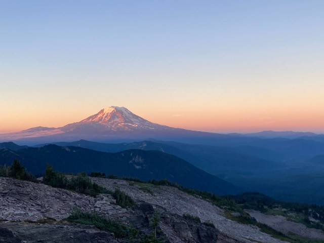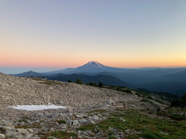We find a campsite that overlooks the mountain and the rolling hills below it and claim it. Jumbo and I set up for cowboy camping together facing the mountain while Tribute takes a more substantial spot for his bivy below. I walk up the hill to catch a view of the setting sun over a ridge and see Rainier up close for the first time. Then I come back down to the campsite, snuggle into my quilt, make a cup of tea, and watch the end of the day settle like a blanket over the remote mountains and ridge lines of Washington. Pikas beep around us. Wind rustles the wildflowers. Goodnight, Washington.