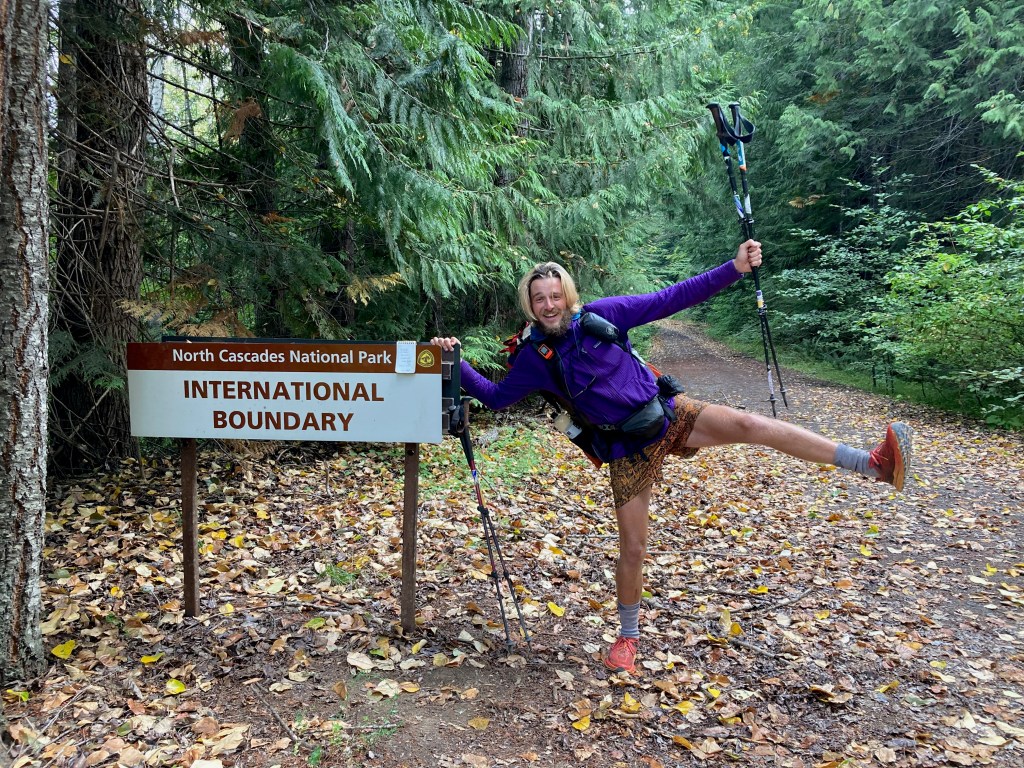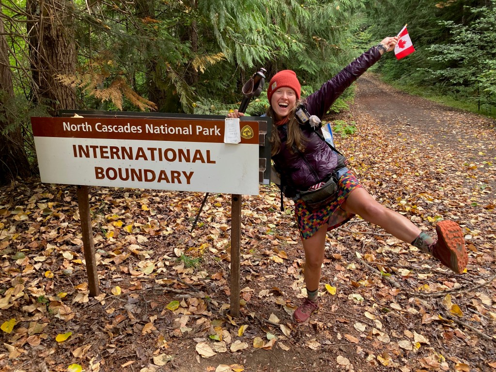 At the sign, I take a deep breath and smile. I’m not feeling super emotional today. I think yesterday took it out of me. Today, I’m just happy to be here in this cool, beautiful autumn world on the arbitrary edge between two countries. Someone left a Rite in the Rain notebook hanging over the sign as an alternate terminus logbook. I read some of the entries, and then leave a note of my own to mark the official end of my journey. Jumbo follows suit, then we take photos.