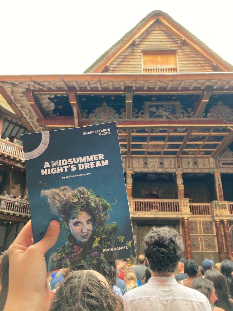 The meal is delicious, and we finish up and head over to the Globe to see A Midsummer Night’s Dream. These tickets were one of the first things I bought when I first started planning this trip. I’m not the hugest Shakespeare fan, but I really love Midsummer. It’s my favorite Shakespeare play, and the chance to see it here, just after the solstice, was too good to pass up. It’s my second time at the Globe—I saw Hamlet here in 2018—but it’s mom’s first, and it’s fun to watch her reaction to her first glimpse of the white walls and thatched roof and highly ornamented stage within this famed O. We’re groundlings; we’re standing in the yard for this whole show. It’s rough on the feet but feels like an authentic experience somehow.