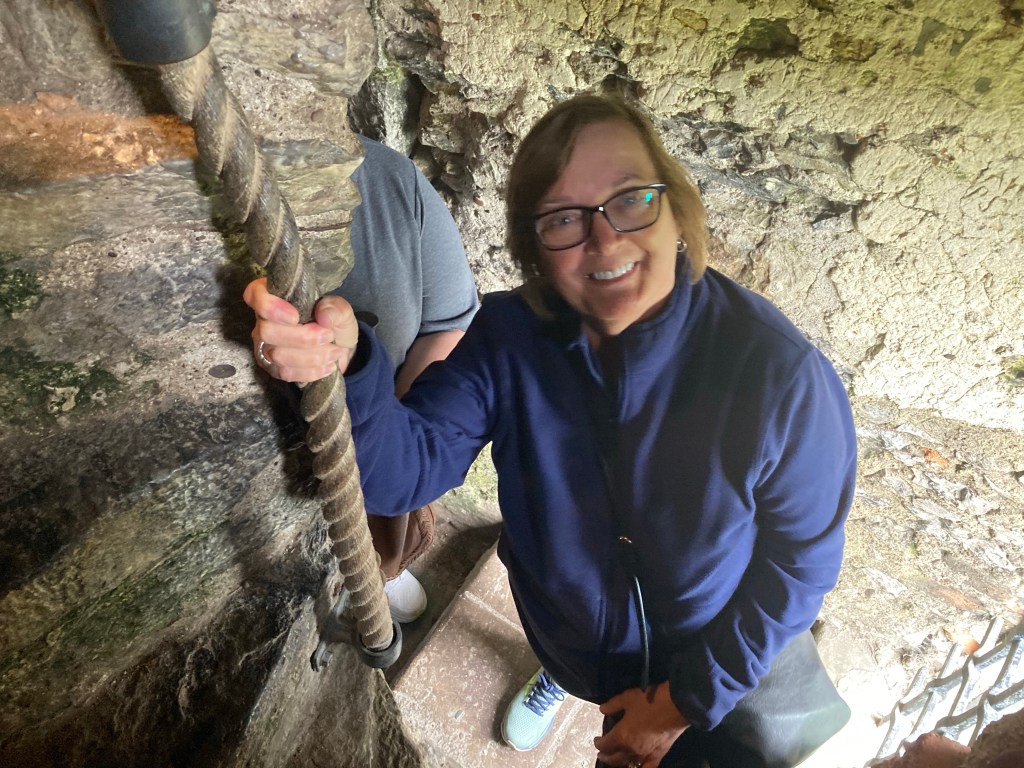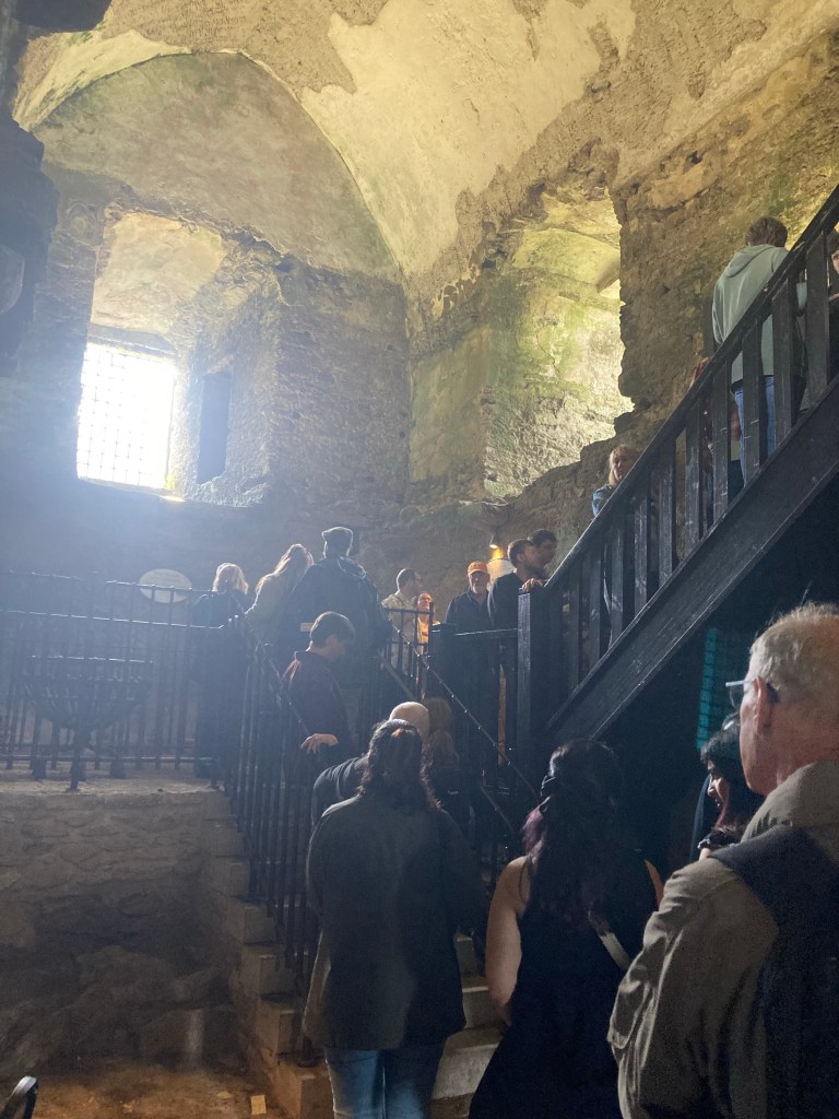 The line winds through various rooms of the castle, up the stairs, through more rooms, and up the tiniest little spiral staircase you can imagine. It would be claustrophobic were it not for the occasional little break of a window or small chamber. Mom isn’t the biggest fan of small spaces and does sometimes have problems with claustrophobia (that’s why she can’t do a middle or window seat on an airplane), but she’s clearly really excited about the Blarney Stone, because the small space doesn’t seem to bother her at all.
