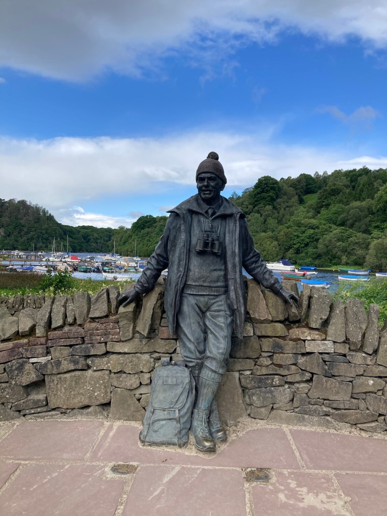 I stand there and chat with them for a bit, then say I’ll see them out on the trail and go meet my mom at the hotel for breakfast. But first, we need to ask the hotel staff how she can get to Inversnaid tonight. It’s on the east side of Loch Lomond, but the major road and therefore all the public transit is on the west side. With the help of two people at the front desk, we check that there are water buses running across the loch today, one to Luss and the other from Tarbet to Inversnaid, and she can take a bus in between. Over breakfast (which is delicious, an extensive spread consisting of all the ingredients of a traditional Scottish breakfast like eggs, beans, bacon, sausage, mushrooms, and what I think might be haggis), we work out the route, and afterwards, we both head out walking down the road, first stopping at the iconic Tom Weir statue. (What I glean from the plaque is that he was a prominent Scottish outdoorist and they’re big fans around here.)