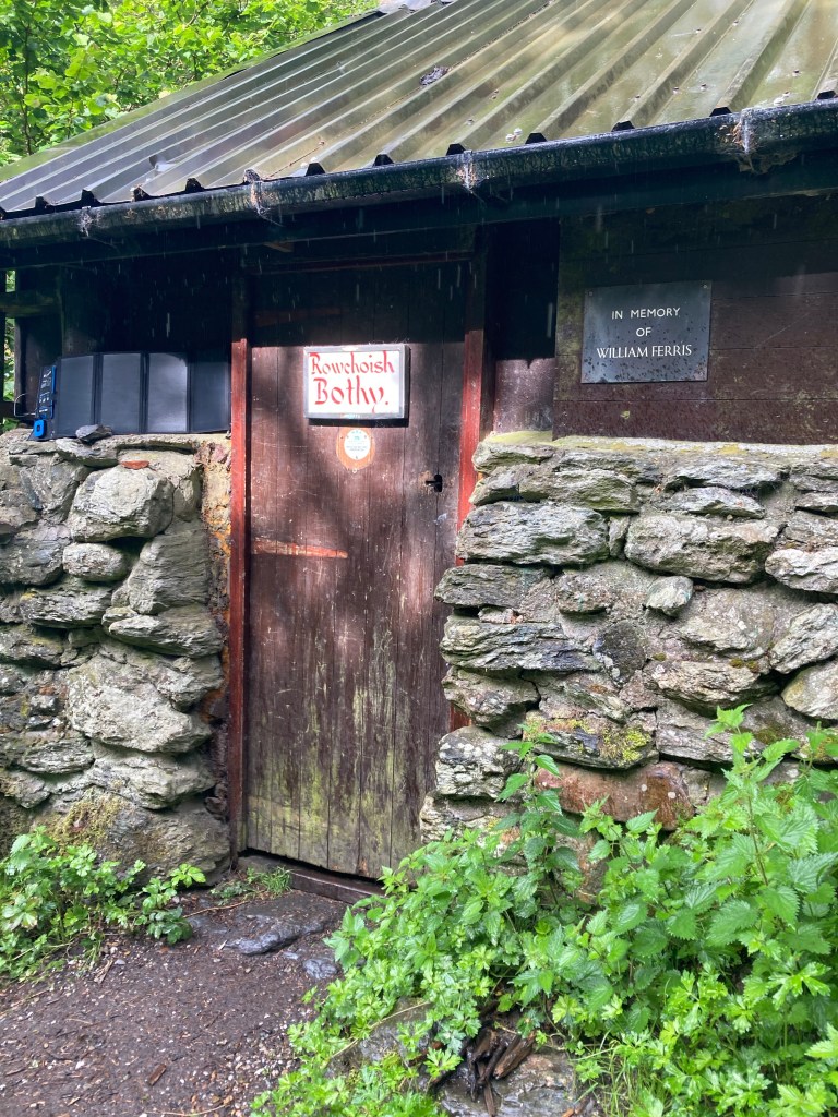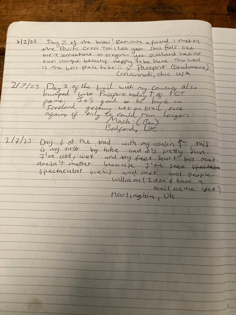 We take the low route right next to the loch as opposed to the easier high route, which means that there are lots of slippy rocks and PUDs, but also very beautiful views of the loch. It starts chucking rain and we dip into the Rowchoish Bothy. A bothy is a kind of primitive shelter, sort of like shelters or lean-tos on the Appalachian Trail. Like AT shelters, they vary in size and intricacy. This one is pretty big and well-equipped with a table, counters for cooking, a fireplace, and a sleeping area. Unlike the AT, many of these have been here for a very, very long time, and are often old barns or built on the site of centuries-old farms. There’s a logbook, in which I write an entry that I sign with my trail name. It feels good.