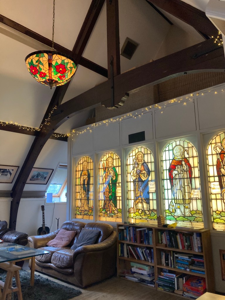 I can’t get through to my mom, so I go into the very posh hotel (I have to take my hiking shoes off and put my pack into a foul-smelling storage room), use the bathroom, and, when I don’t see her anywhere and figure that they are probably not very friendly to hikers, continue up the road to the Inversnaid Bunkhouse, where we have a reservation. It’s a really cool place, and I’m instantly glad we were able to get a room here. It used to be a church, and they preserved the original structure and stained glass, but added a level so that the top floor is a cozy bistro. The guy tells me that yes, my mom is here, and he shows me to the room. Reunited! We compare our days, and she tells me about how they were not super friendly to her in the hotel so she walked up here.