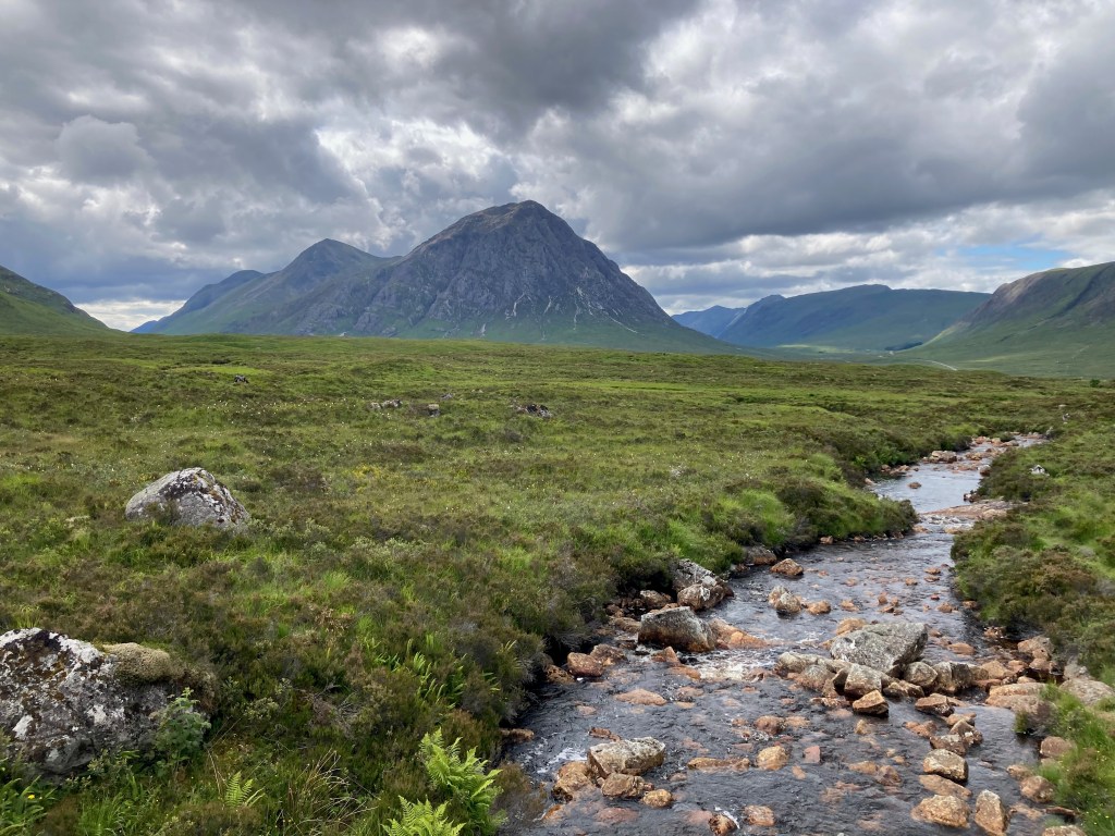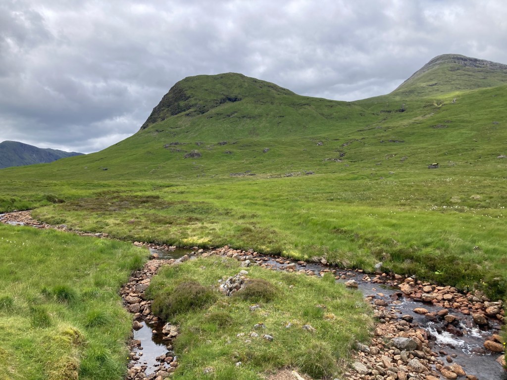 As we begin the long descent to Kinlochleven, Mash tells me about his studies in geology, including a project for his thesis where he and a group spent some time in a remote area of Scotland. I ask if studying geology still influences his perspective, especially while hiking. “Oh, yeah,” he replies, and begins telling me about the landscape from a geological standpoint. This isn’t an area of study that has staying power in my mind; it’s hard for me to grasp and the concepts sort of slide right off. But it is really interesting to consider the specifics of how features of this place were formed. It reminds me of how I started seeing the woods around my home differently during COVID once I started getting into mushroom foraging. When you’re looking for mushrooms, you have to know what trees to look for, and where to find those trees. A side effect of trying to find things to eat in the woods is that you notice so many more intricate details of what’s growing: the way some bark looks, the patterns and number of leaflets, the names of certain wildflowers and where and when they tend to grow. It’s like having another set of eyes—for a moment, I see this particular world through those of a geologist.