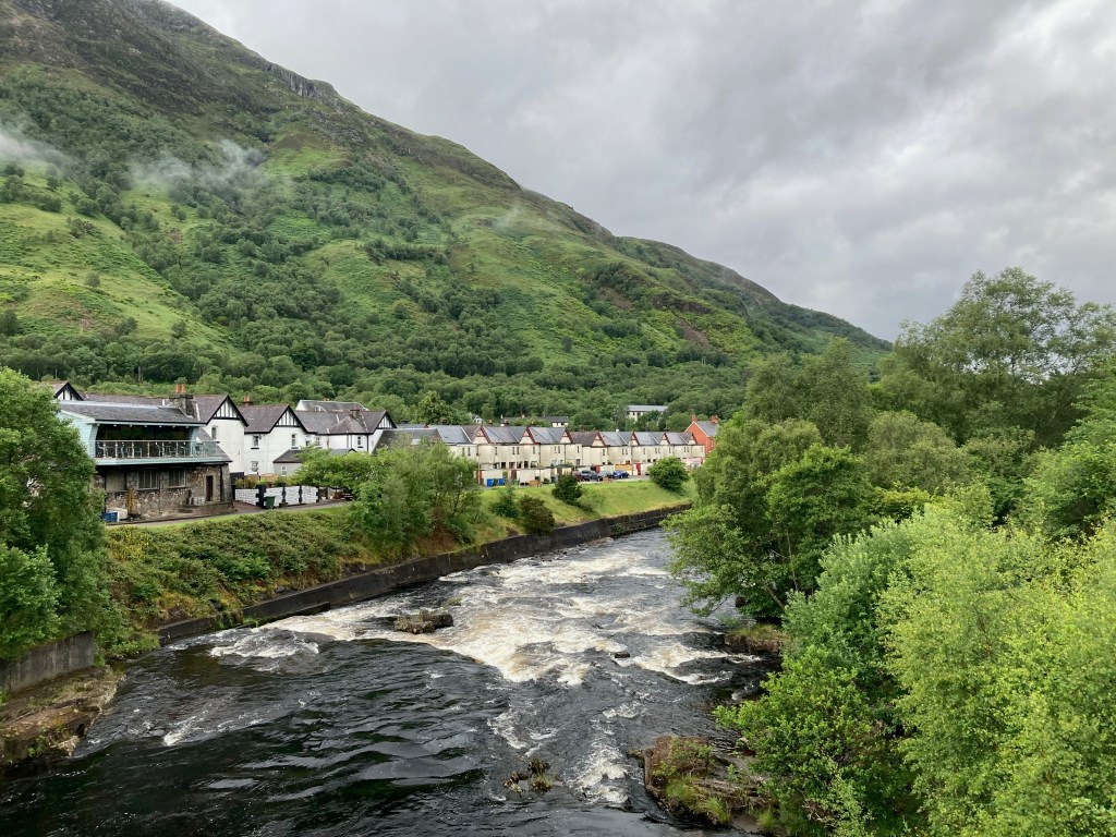 We keep going back and forth about this on the steep downhill into town. Then, before we know it, we’re arriving at Blackwater Hostel in Kinlochleven. Mash goes to set up his tent and I meet Mom in the hostel. She’s had a nice little walk around the town, enjoyed a spot by the river, and found a waterfall. It is a really cute little place. The hostel is sort of strange in that they only rent rooms as single occupancy, so although there are eight beds in this room, we’re the only ones in it. And we have two bathrooms to ourselves! Weirdly luxurious.