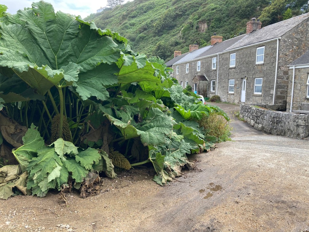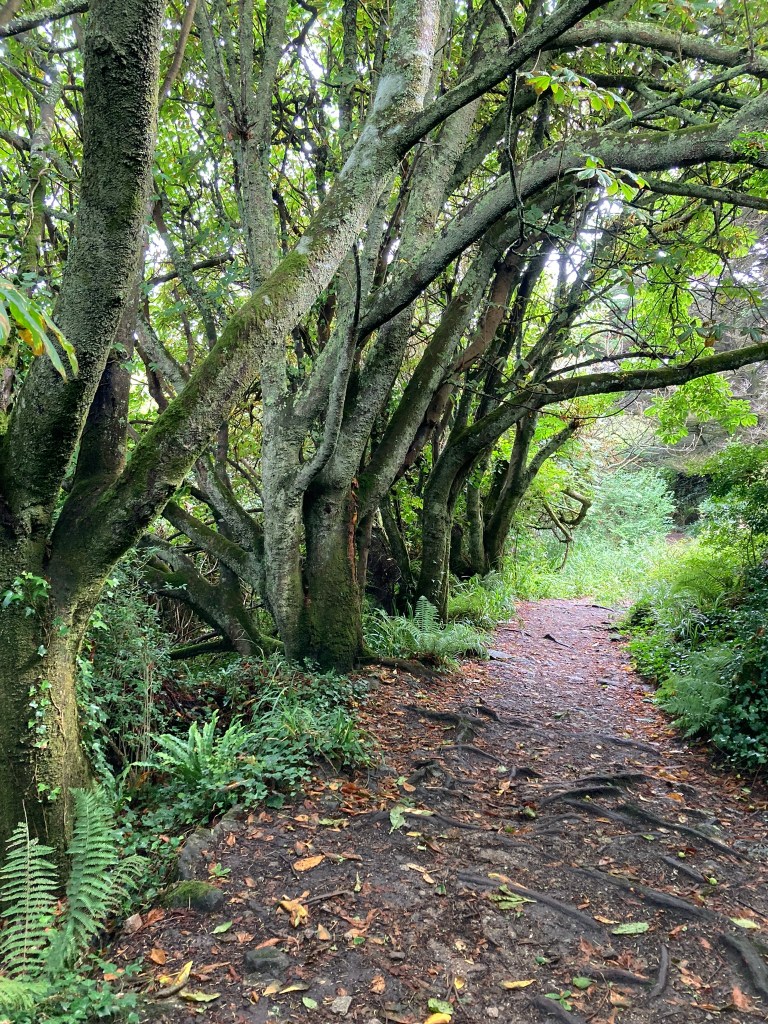The trail first goes sharply up a hill that rises quickly out of town. Before long, I can turn around and see all of Mousehole and its harbor. The hedges are a riot of flowers and grasses on either side of the rapidly narrowing lane. Then the trail turns left, leaving the road, and enters a gravel track that soon becomes a wooded path. I pass a few other hikers coming the other way. Then I remember with a feeling of “duh” that I had a friend message me on Instagram saying that she’d just been to Mousehole and did a walk where she had to wear long pants and long sleeves because of all of the nettles. I look down at my very exposed legs—I can’t stand hiking in long pants and put my hiking skirt on by default—and brace myself for the sting.