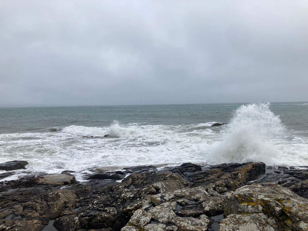 After lunch we stay there for a while soaking in the waves. We’re mesmerized. The sea, now at high tide, is very choppy today, crashing with a vengeance against the rocks, totally covering the rock pool we walked along last night. It’s easy to see why the Mount is closed today. It’s on the verge of scary. It’s cloudy, but still kind of bright, so I have to put my sunglasses on. Still, it’s relaxing in a trancelike way. “I could sit here forever,” I say, and mom nods in agreement.
