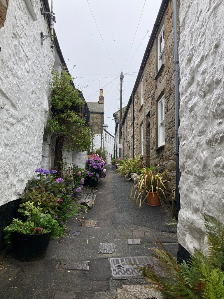 The overgrowth doesn’t seem as bad on the way back, but nothing seems as bad once you’ve gone through it already. The cliff views slowly fade, I enter and pass through the Kemyel Crease, survive that really rocky muddy bit without losing my balance completely, and soon, the trail dumps me back out onto the road again and I’m walking downhill towards Mousehole, the water of the harbor swaying and shimmering in the light.