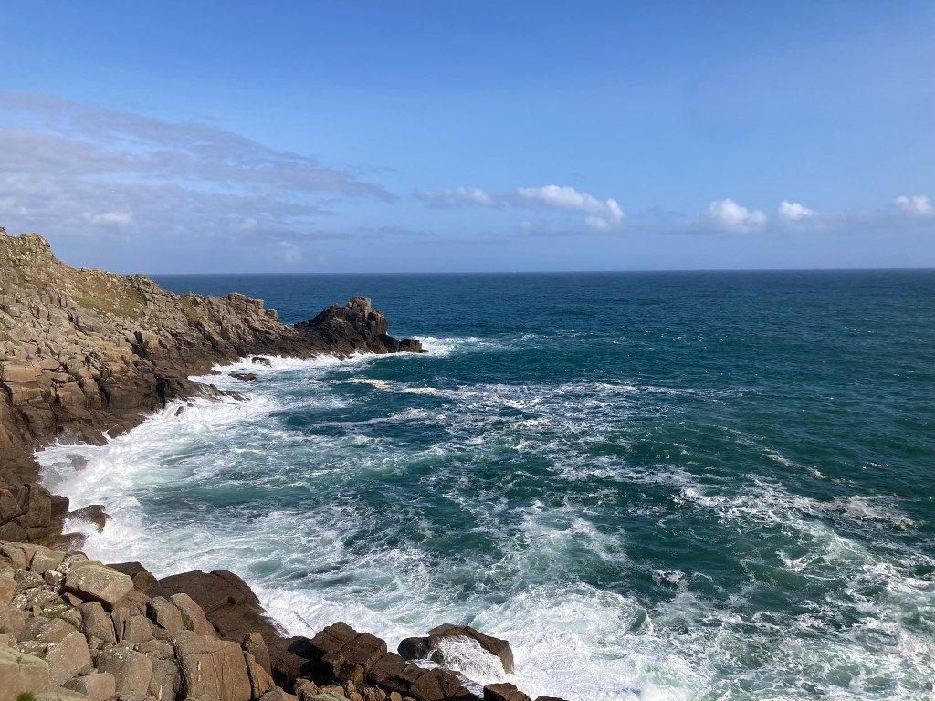 The next section does involve some overgrowth, but none of it holds a candle to the really bad muddy bit I just went through. The plants start to get smaller, and I can see way out into the ocean. There are more rocks, and then what I’d probably more accurately call cliffs, and massive white waves crashing against them, spraying into the air. I stand there in awe, watching the water gather into wave after wave, then come hurtling towards the shore and CRASH! Every time a good one rolls by, I can’t help but let out a cheer of “woo!” The energy propels me up the next hill, and at the top, I can see the Tater Du lighthouse far in the distance, and the break in the cliffs that leads to the little town of Lamorna Cove. The waves are thundering and the wind is pushing me around and I am just there, transfixed, a little moving bundle of energy on this huge, fathomless shore.