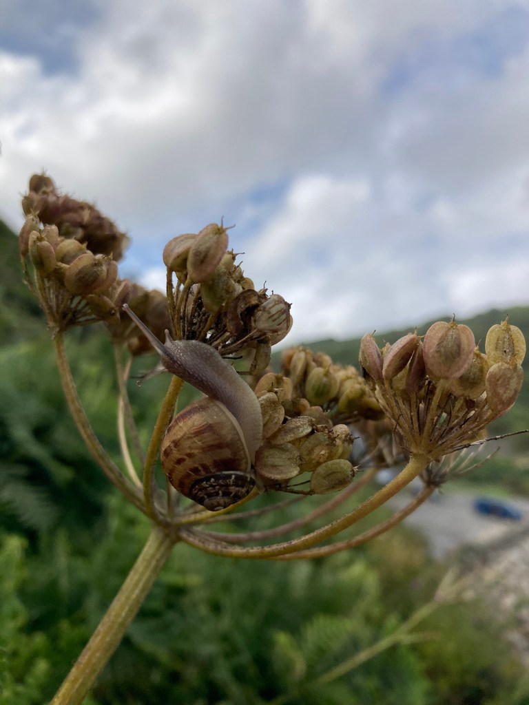 It seems like this part of Lamorna isn’t really the town; there are a couple of cottages and a little shop that closed at 4. But there is a very nice bench, and since I’ve decided that I won’t make it to the lighthouse, I have some time to spare and have a seat. I then walk up to the wall at the edge of the land and watch more waves break against it, then find another little hidden bench up a hill a bit and take in the view. I realize also that there are snails all around me, chomping on plants. Once I see one, I see a bunch of them. Then I notice that my foot is very close to one. Oh no! I don’t want to be responsible for snail death, and it’s getting close to dinner time, so I walk back the way I came on the path.