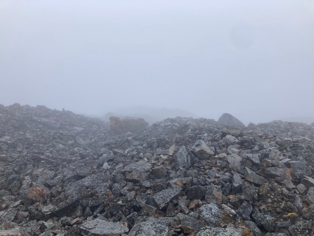 The others follow, and we take a minute to regroup at the summit. That was scary! But we’re okay. Then we head to the left and find ourselves on an alien planet. It’s misty and we can’t see anything except for the gray rocky ground. There are some lichens at least? But no other life apart from that.