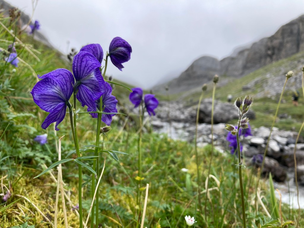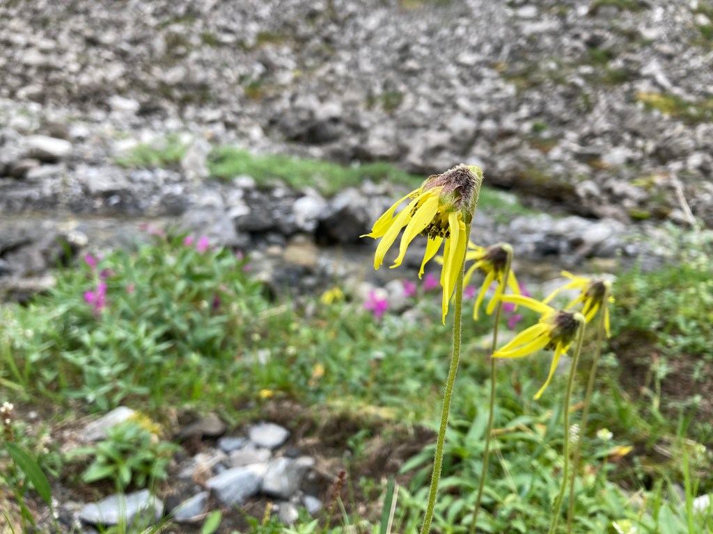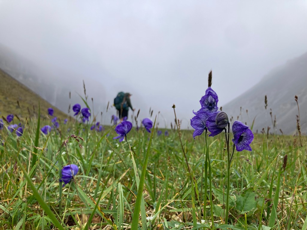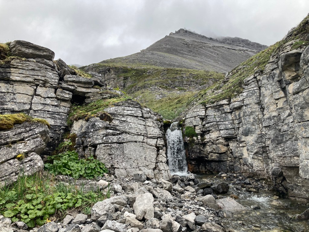 There are clouds shifting around the mountains. It looks and feels mystical and old. We’re walking along a nice table and then we come upon a creek, take a snack break, and descend to cross it. Back up the hill and onto another shelf. Then we go down towards the creek, cross it, and follow along the other side. There is another small creek crossing. It’s in a sort of gully, and when we get down into it there are flowers and neon green grass and a little waterfall sculpting the rocks. One of said rocks is very sharp and swipes me on the side of the knee as I walk past, but I’m not terribly bothered.