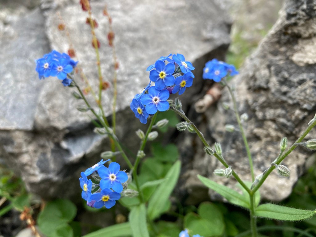 We take a break alongside a creek with perfectly green moss strewn with flowers. There are little tiny blue ones, purple ones, yellow ones with nodding flowers that look something like the flower of a trout lily. I wish I knew their names.