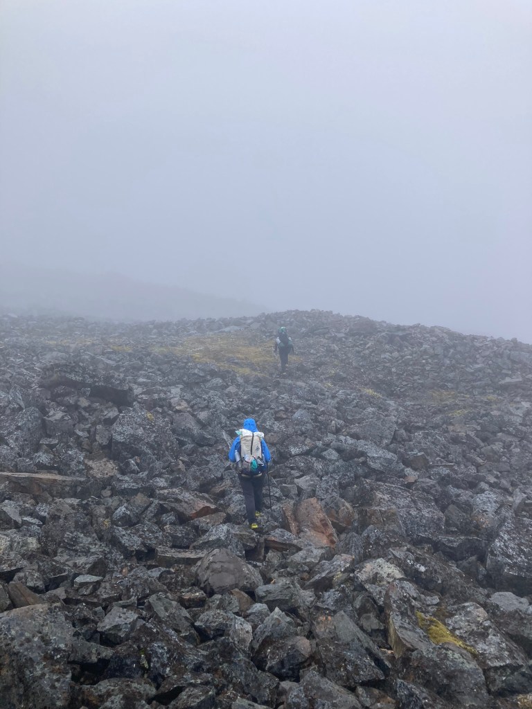We keep picking our way through the terrible moonscape, Carrot and Gahl ahead and Chelsea and me following. It’s getting pretty cold now, and still misting. Gahl asks if we want to stop and put rain pants on, but I’m already so wet and I keep thinking that we’ll arrive soon, so it doesn’t seem worth it.