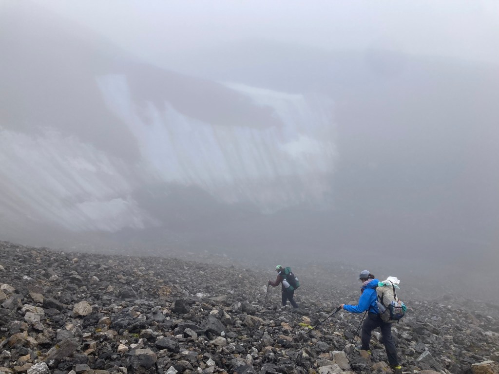 The hill takes a turn to the left and we see a giant snow patch. It seems to get even more giant as we go up. It’s ice and snow, it’s not on the map, and it’s very steep. We stay to the right of it on the scree, but the problem is that the steeper the incline gets, the less stable the rock becomes. Every step sends you sliding down, not quickly or in a way that feels life threatening, but scary enough to make you freeze. I head up after Carrot and then cling to the rocks. Gahl and Chelsea follow, neither of them loving the loose rocks either. I guess my lunch really worked wonders because I get a little more confident the higher we get. I realize that if I walk right next to the snow, the rocks can’t go anywhere so they don’t slide. It’s precarious because one step on the ice could send me sliding down, but it’s a lot faster, and I just rely on adrenaline to rocket me up. Then I’m at the top away from the snow.