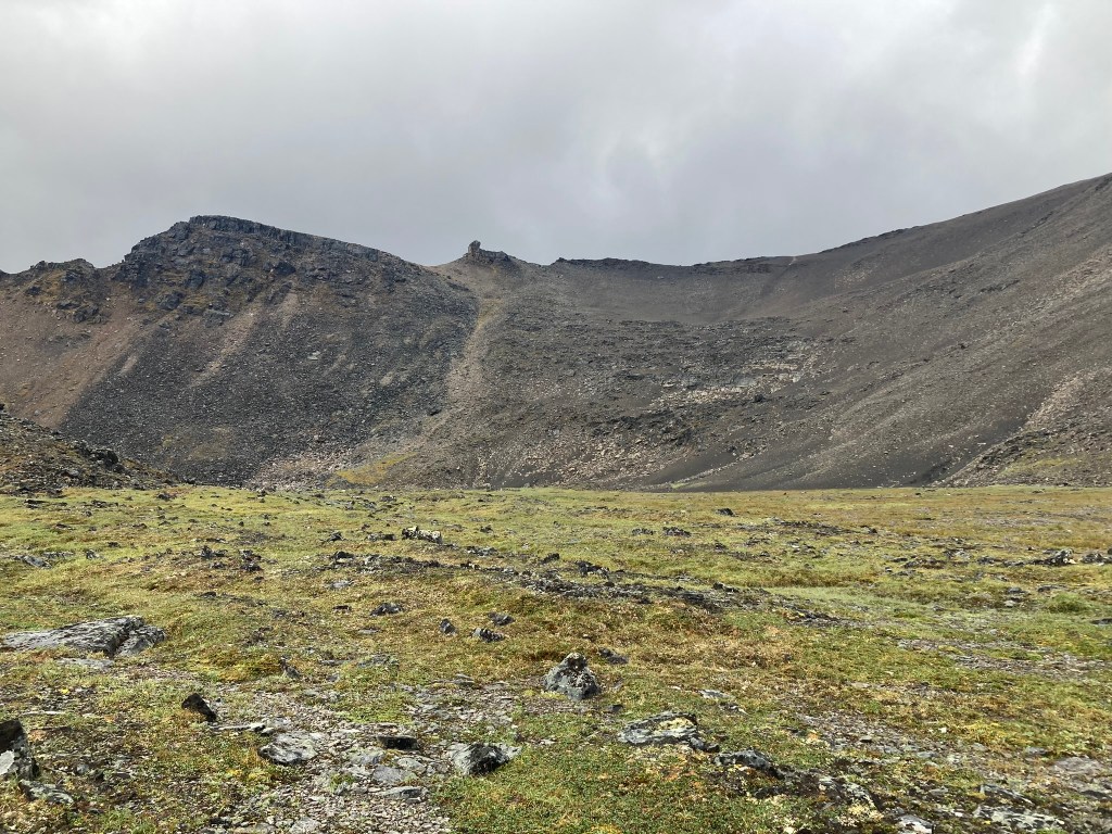 At the top of said short hill we can see the goal we’ve been working towards: a huge green valley with a meandering braided river cutting through it. We take a look at the land and try to decide where to head for camp. We spot a flat-looking place down to the right. It turns out to be so lovely, the softest hug of a tundra. We go to get water in the stream and then set up our tents.