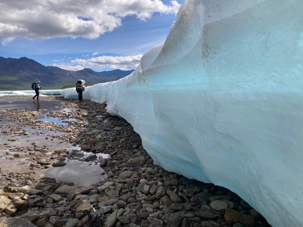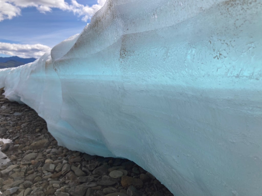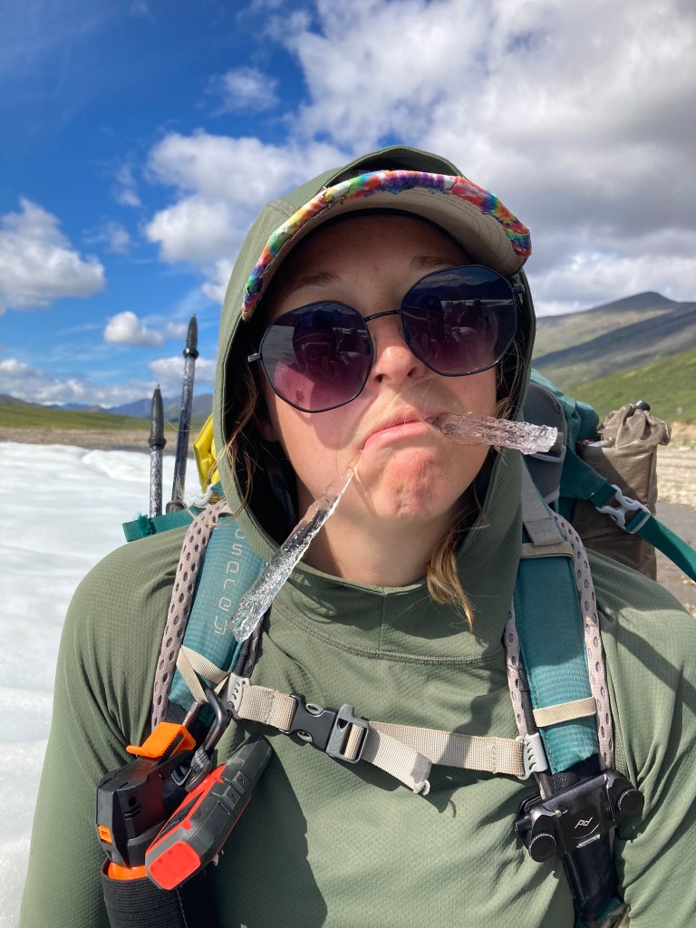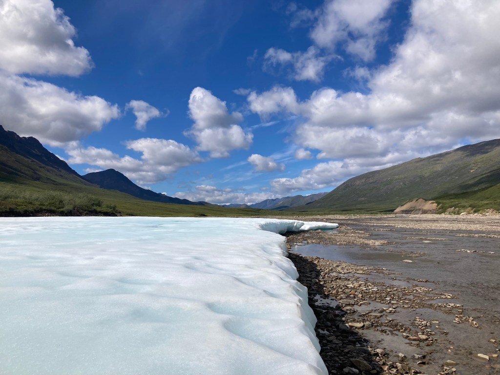 As we follow the river, in the distance we spot something white. Snow? Carrot thinks maybe it’s aufeis, which is compressed snow above a river that never melts. It could be that, or possibly just very intense snow that has stuck around this long into the season. Either way, as we get closer we realize that it looks so, so cool and we want to play on it. It’s blue underneath like a glacier, and the texture of a sno-cone on top. It’s causing a sort of cool breeze right on the water that feels magical in this surprisingly warm sun.