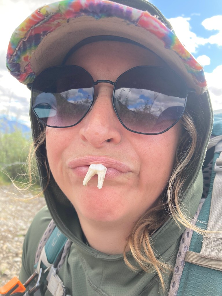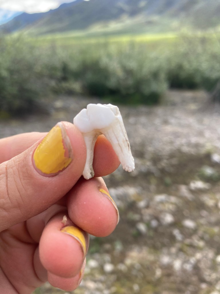 After lunch I sort of enter a fog, even though I had a coffee and electrolytes. We bushwhack through some willow, lose the trail, cross the creek a bunch, then navigate more willow. We find some teeth that we think might belong to a moose. Actually, we’ve seen lots of tracks today—moose, but also bear and what we think might be wolf.