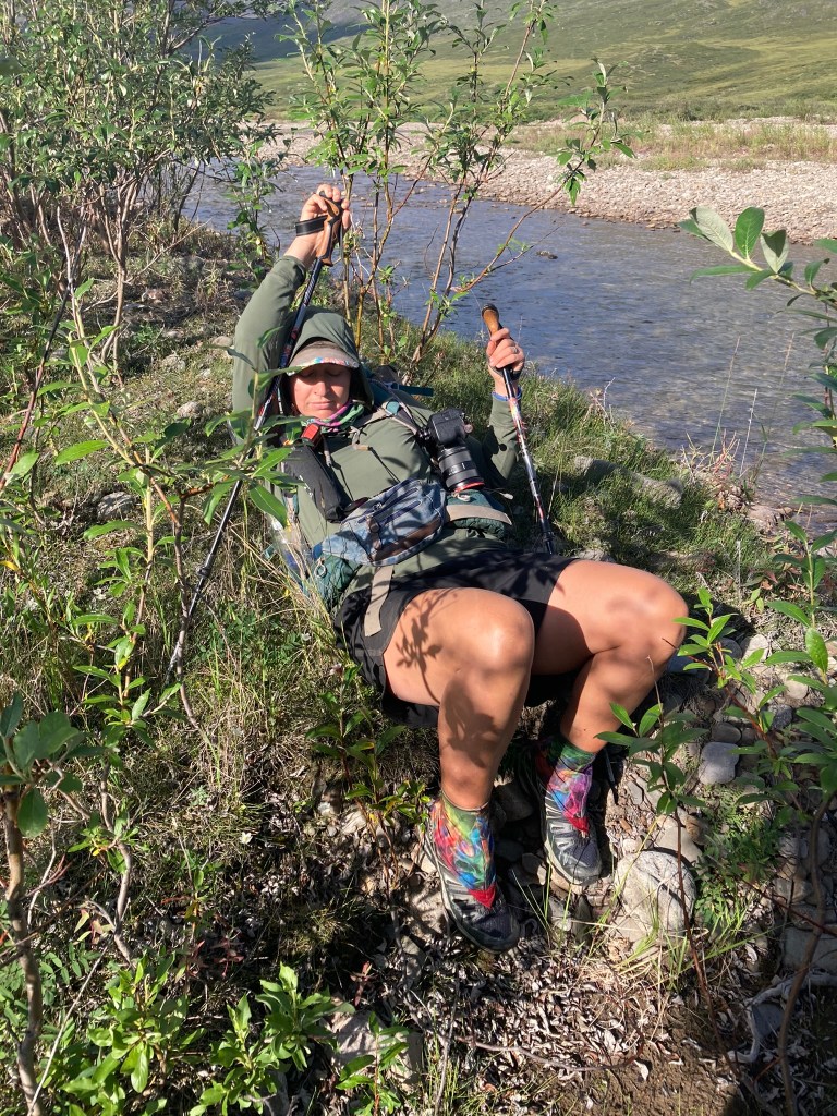 Lunch isn’t much farther off. We navigate some boggy willow bits and then come upon a river with a nice sandy beach. We take an hour—a whole hour!—and luxuriate on the banks. Chelsea gets in the creek again. She does cold water swims at home so I think that’s a bit of a thing for her. I’m not into it, but it does look like a nice day for it, with the sun shining directly on us.