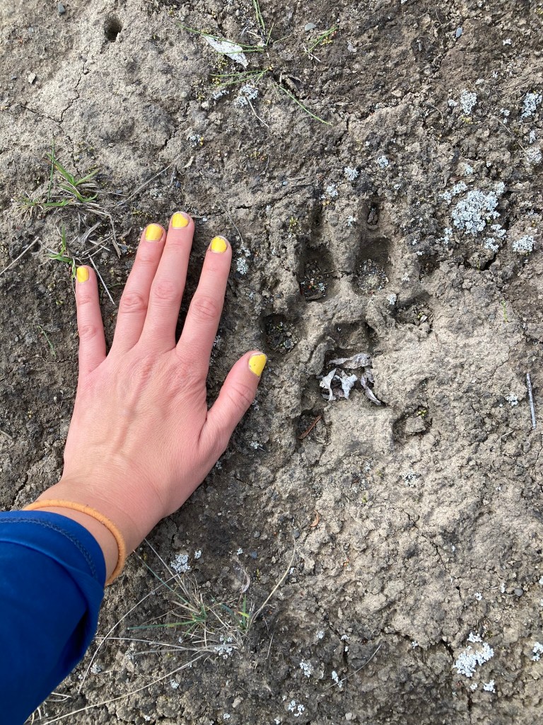 I have to stop suddenly for a cathole (cloudberries, probably), and after that I meet back up with the other three, who point out three sets of tracks in the mud: moose, wolf, and bear, all together. They’ve each added their footprint next to the animal tracks, so I do too. All sorts of animals out here!