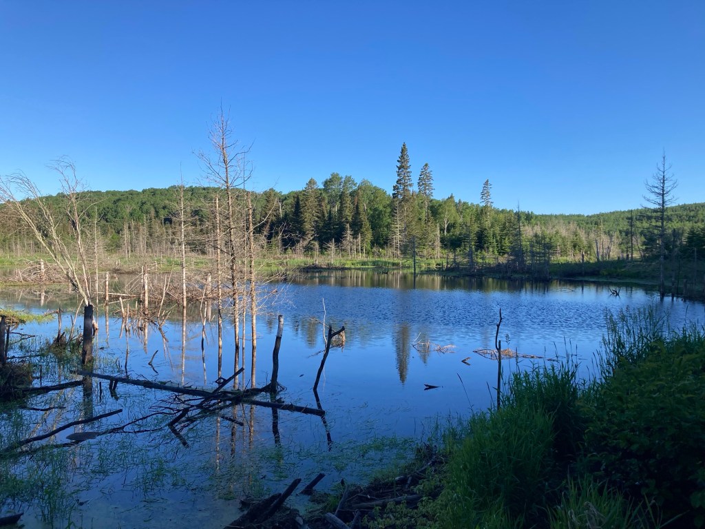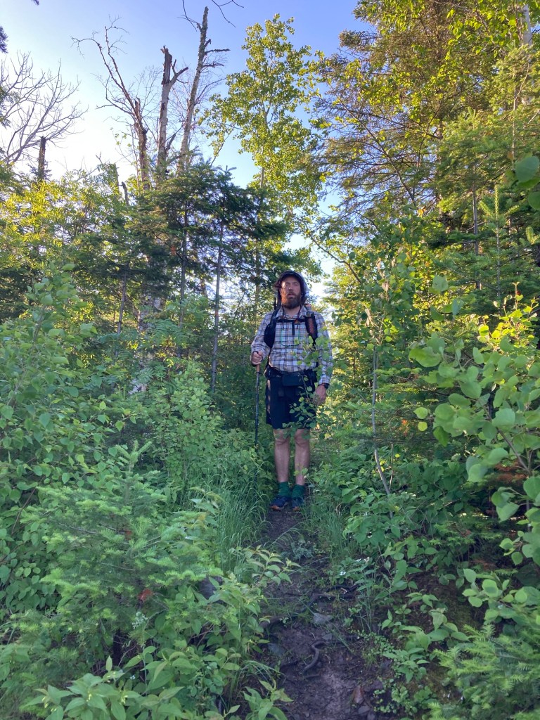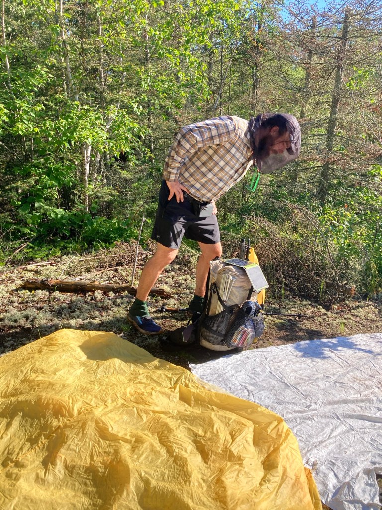 The hiking was slow going. It was overgrown, muddy, and mosquito-laden in many parts. We stopped for a quick break at North Carlson Pond campsite, but we didn’t last very long before heading out again because the mosquitoes were relentless. More mud, some boards, some roots and rocks, and then we were rounding a corner and out of nowhere the most beautiful breeze I have ever had the good fortune to feel came dancing around the bend just as the path turned into some gently forested aspens on the side of a hill. We spotted the South Carlson Camp on our left and walked up the hill for our glorious lunch spot. I got water at the creek, laid out my wet tent and tyvek, and settled in.