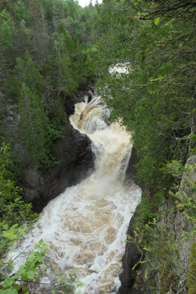 So we sent it. More downhill as the river turned even more violent and headed for the rocks. It churned downward over the edge just as we arrived at a viewpoint with a wooden railing. Behind it, we could see the roiling cauldron beneath the waterfall called Devil’s Kettle. The name is apt. The water sprints downward over the rocks in in a terrifying, violent descent towards the bowl-like basin below, where it falls so quickly that the water turns into a swirling torrent that literally looks like it’s boiling. It was mesmerizing, powerful, and scary.