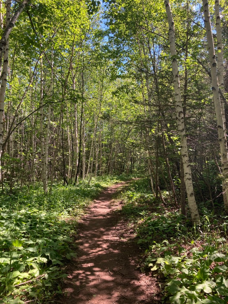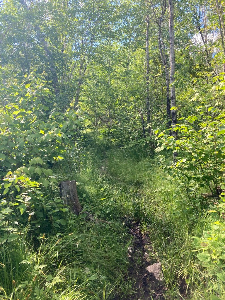 There is some genuinely nice trail after this. We’re talking, flat, no roots or rocks, dry, level. No plants touching me. No mud. It walks through a stand of birch trees and I almost want to dance it is so beautiful. If the trail was always like this, I would be loving life. Yet again I think about how beautiful this would be in the fall right here, and how we may have made a mistake coming in this wet, buggy season.