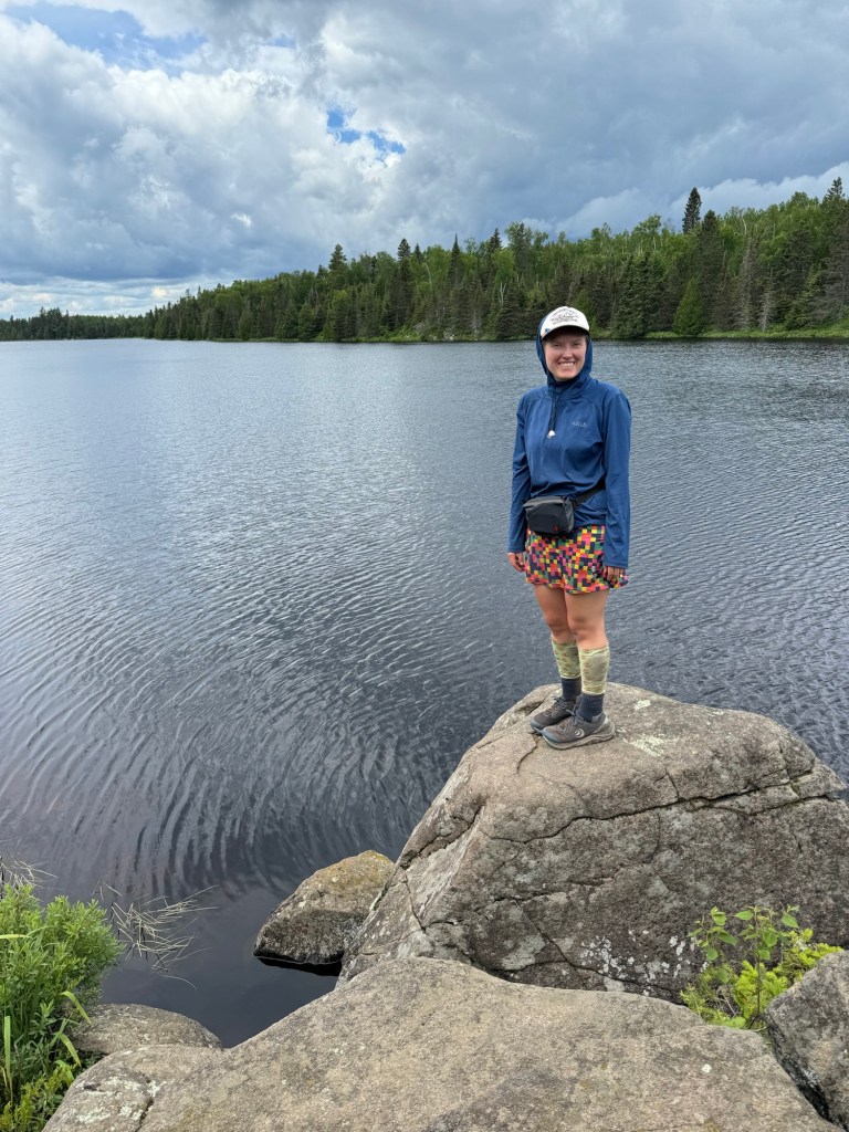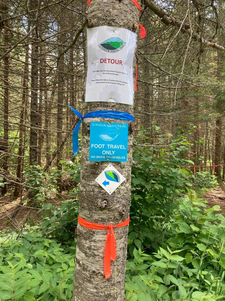 We continue hiking until we get to Sonju Lake Road. Ahead on the trail, there is a closure that takes us on this road to avoid a downed bridge over the East Branch Baptism River. But we decide to just take the road all the way, because ease, because no mud, because hike your own hike. It’s lovely. There’s a breeze, there’s sun, there are fewer bugs, and we absolutely churn out the miles. We reach the trail again after the closure.