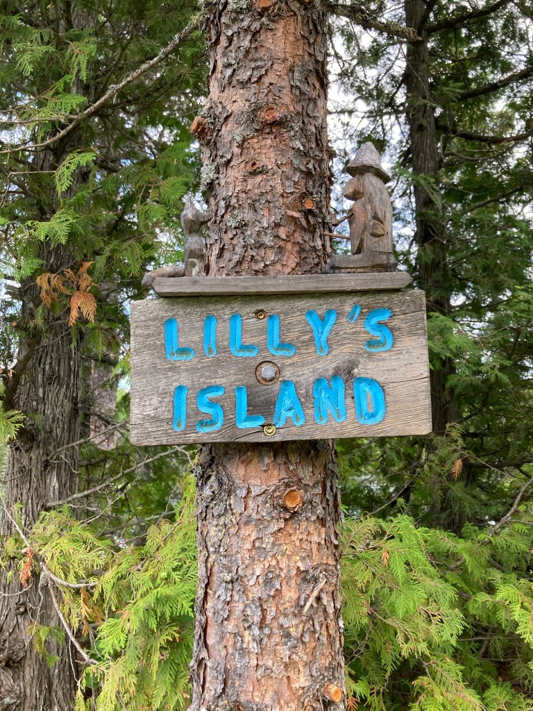 There is a sign on a tree that indicates this place as Lilly’s Island. On top of the sign there are two carved figures: one appears to be a gnome of some sort with a fishing rod, and the other looks like a fox. A few feet further, there is yet another pristine SHTA logbooks in a blue box on a post. It feels like I’ve discovered something secret.