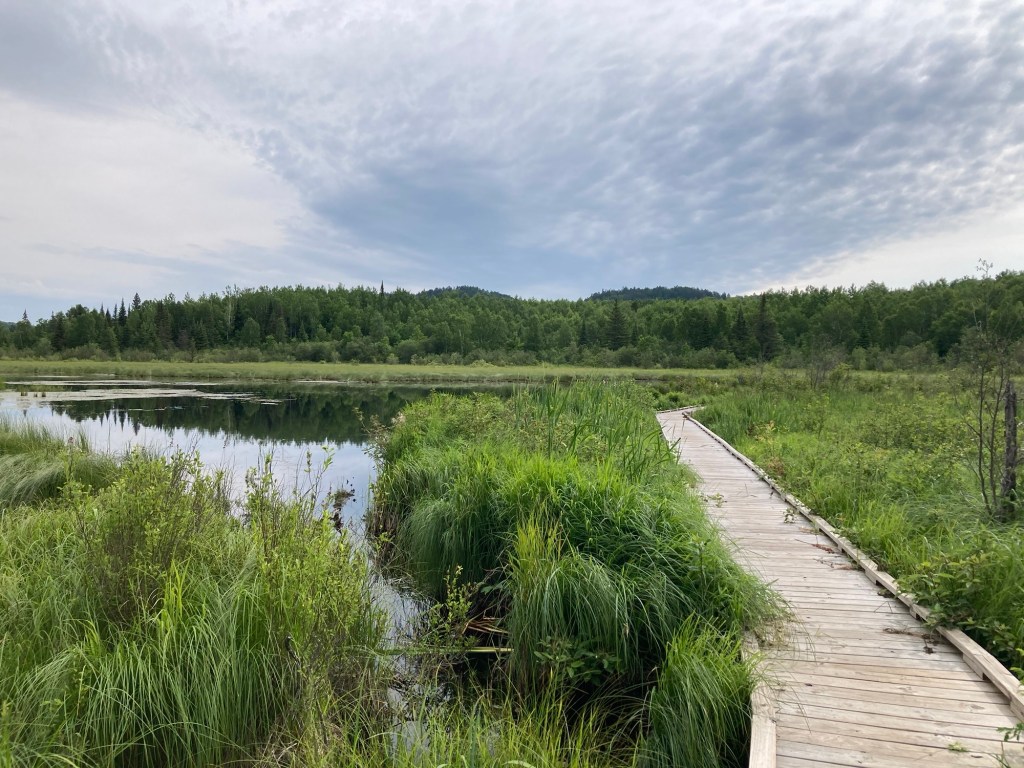 Some bog boards, a road crossing, and then we are officially in Tettegouche State Park. There is a trail reroute here because of a downed bridge, so the mile marker we thought we would be ending at turns out to be farther down. We continue on the wide, slippery trail down towards the bridge over the Baptism River, cross it, get confused, ogle at the amazing mouth of the river as it meets the lake, and then end up at the State Park Visitor’s Center. The Center itself is closed by this point but the bathrooms are not, and there are functional vending machines and a water bottle filling station. And trash cans! Bless! We hardly know what to do first, but we end up with fresh water, clean hands, emptied trash bags, two cans of root beer, and a bag of Cheez-Its that taste like salty processed heaven. By now the sun has come back out and everything is glowing and feels like it’s going to be okay.
