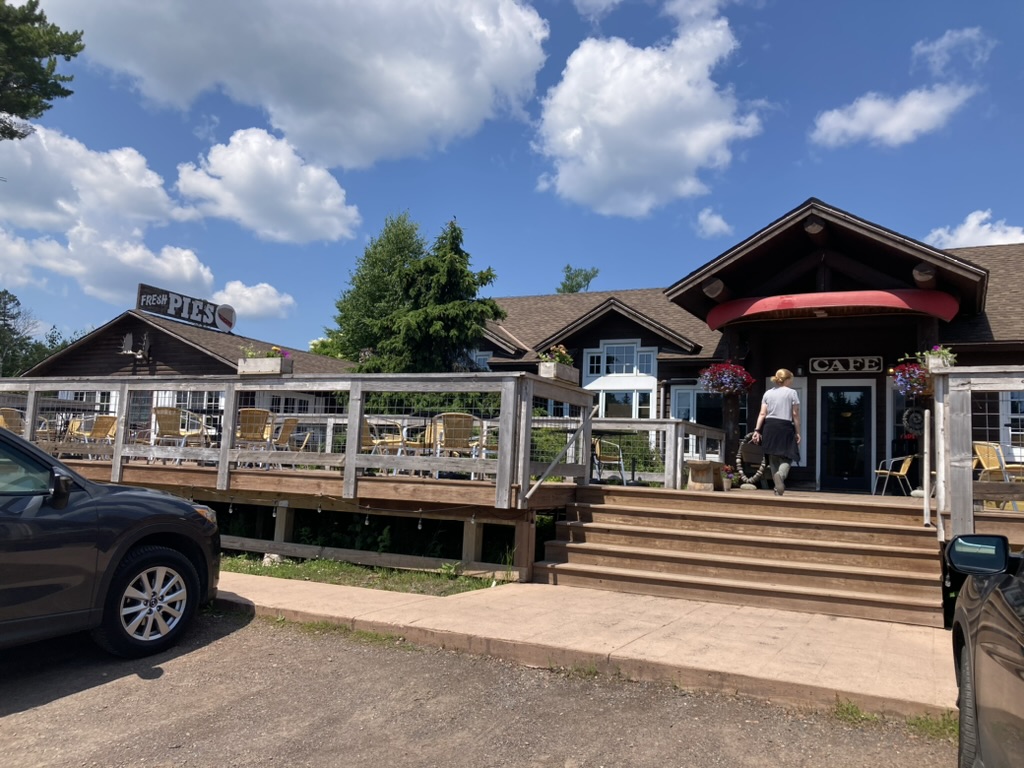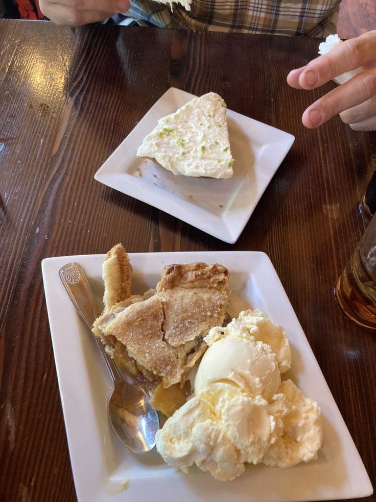 We take a spin through the local art shop first, which is cute but nothing strikes me, and then we consult Google on the restaurant across the street. It looks kind of pricey, but I see just down the road that there’s a place called the Rustic Inn that is at our turn, and they have lunches and pies. That’s our choice.