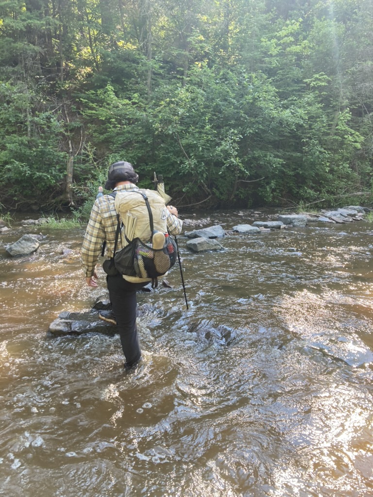 At first this flat section is nice. It’s slightly muddy but nothing crazy. But then we cross the final road to begin our last mile of trail before camp, and it turns into the nastiest, thickest, longest stretch of muddy slop I’ve seen on this entire hike. It is relentless. There are only brief pauses of solid ground before it goes back to mud. At first I just put my head down and try to stay as dry as I can, but eventually I can’t avoid it and I start to feel my blood boil. I have a little meltdown and slam my poles into the ground and call the SHT some choice names as I inadvertently splash more mud farther up my leg. I am just so deeply, entirely done with this trail. The mud is my nemesis. It sucks, it removes all joy from the movement of hiking, it’s disgusting.