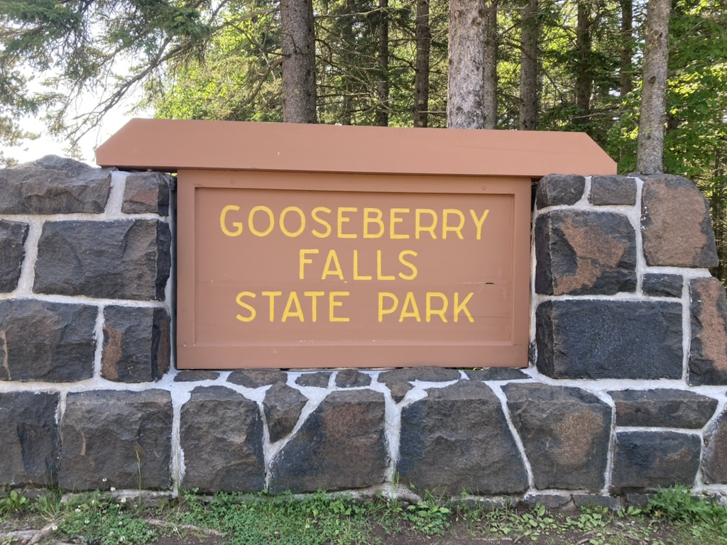 Eventually the falls win out, because why are we even doing this if we aren’t going to see cool stuff? The road is beautiful and easy to walk on. When we get to 61 we cross it and find our old friend the Gitchi-Gami, which we walk on for a bit until we arrive in the park.