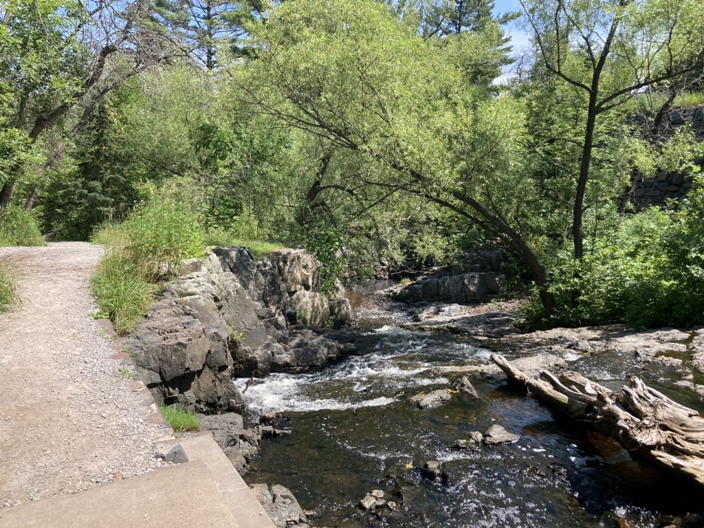 We begin the section leading us into Duluth, following Vermillion Road to a neighborhood to a hot, large main road that’s under construction to Hartley Nature Center. We’d hoped for vending machines, bathrooms, or at least a water spigot here, but there is none of the above. There are picnic tables, though, so we sit in the shade and have a little hiker lunch to energize us for the last few miles.