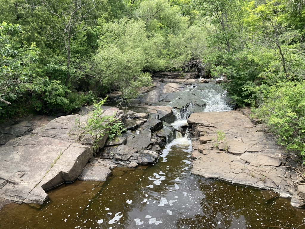 It then descends into some gorgeous woods with wide, packed-down, well-maintained path. Even so, the day is already incredibly hot and somehow also raining on and off. We look at Avenza and Machine proposes to get off trail at the next major road crossing and walk to an area with restaurants. “We can have lunch, I can watch sports, and we can be in the air conditioning,” he says. “That sounds like a much more fun way to spend my birthday to me.”