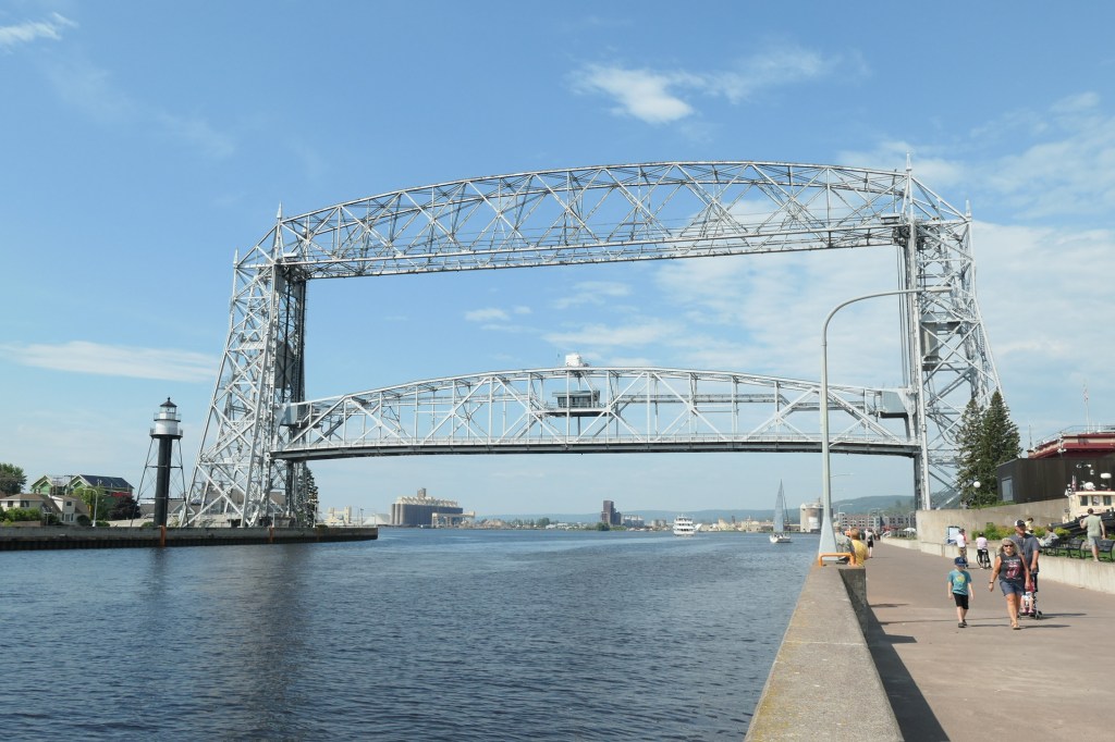 The “trail” continues along the shore and towards the aerial lift bridge that Duluth is famous for and that dominates the city’s skyline. We walk first out towards one of the lighthouses marking the entrance to the canal, and then when we see a small tour ship coming towards the entrance, we walk back towards the lift bridge to see if it’s going to rise to let the boat in. It does! It is absolutely amazing to watch. An alarm sounds to prevent cars and pedestrians from entering the bridge, the operator waits for the last of the people to clear the bridge, and then it lifts up slowly. We watch the boat pass under it, and then the bridge descends. Engineering is so cool!