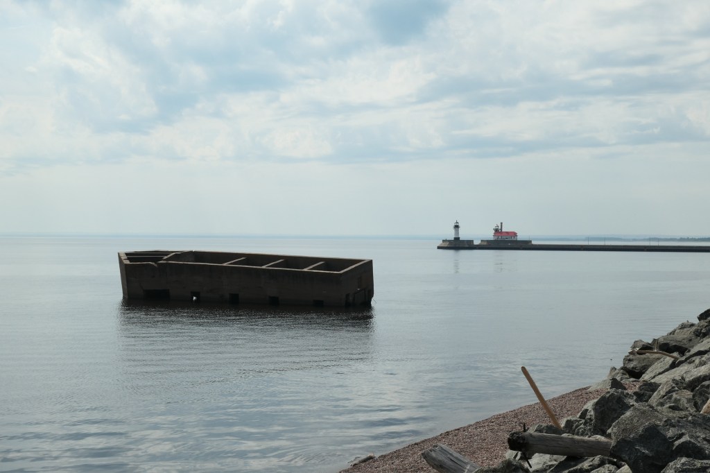 When we head out around 10 (with Machine’s pack decorated obviously), it is not raining like the forecast said it would, and it’s bright and lovely outside, and already quite hot and humid. The trail walks along the boardwalk bordering Canal Park. We walk past the strange sight of Uncle Harvey’s Mausoleum in the harbor. It looks like a shipwreck, but Father Google tells me that it’s actually the remains of a sand and gravel hopper built in 1919, when Duluth had an outer harbor and, to alleviate some of the shipping traffic, Harvey Whitney built the structure to store the offloaded material before it was transported to trains. But it was difficult for boats to unload in the outer harbor, so the project was abandoned just three years later in 1922. It eroded and ended up perched crookedly in the water, 30 feet from the shore. When we walked in yesterday, we saw people swimming out to it and jumping off, which is apparently a popular pastime in the city.