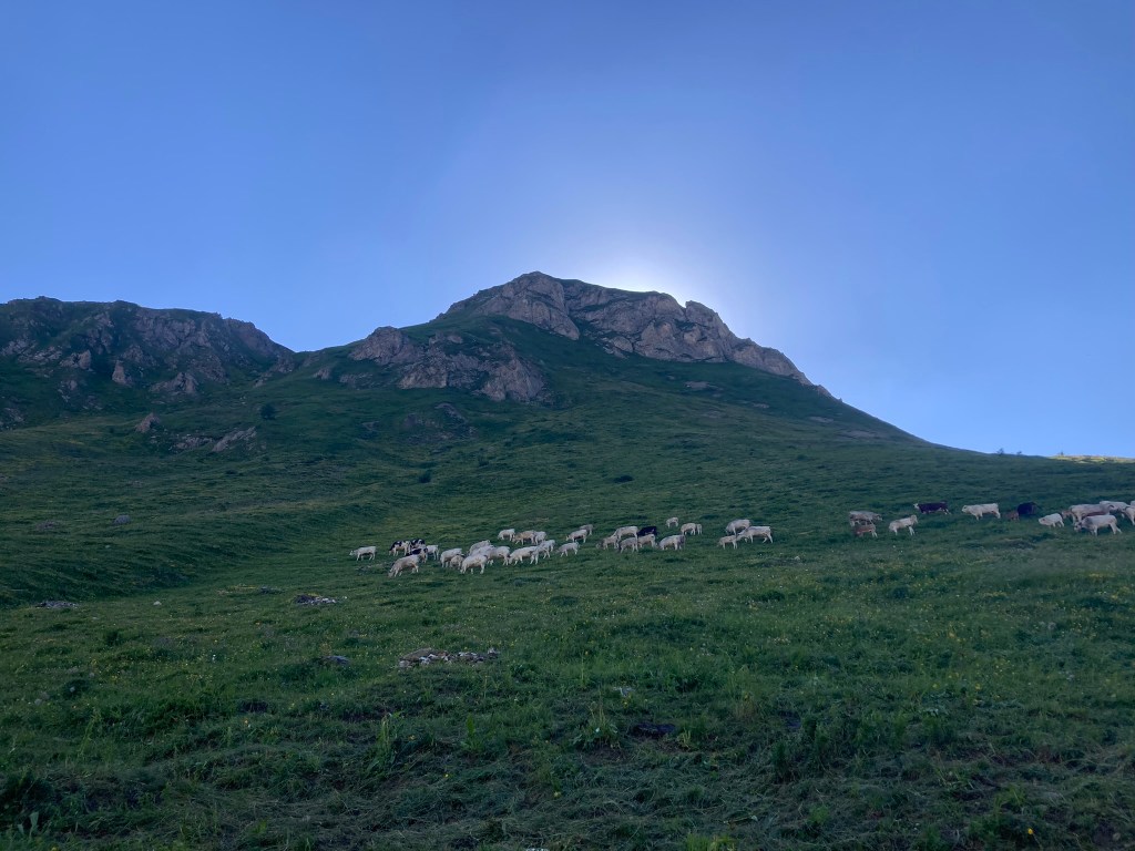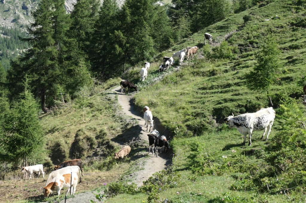 The only roadblock on the very level and enjoyable hiking after Rifugio Bonatti is a herd of cows that freaks us out. We’re just minding our own business and walking down the trail and all of a sudden there is a bunch of mooing, and then several cows with very big, scary horns seem to be following us. Neither of us had any idea that we could run as fast as we do with our packs on. Finally, we perch at a spot up the hill in the shade that seems to be out of their way enough for the entire herd, and after a few moments they pass—very slowly.