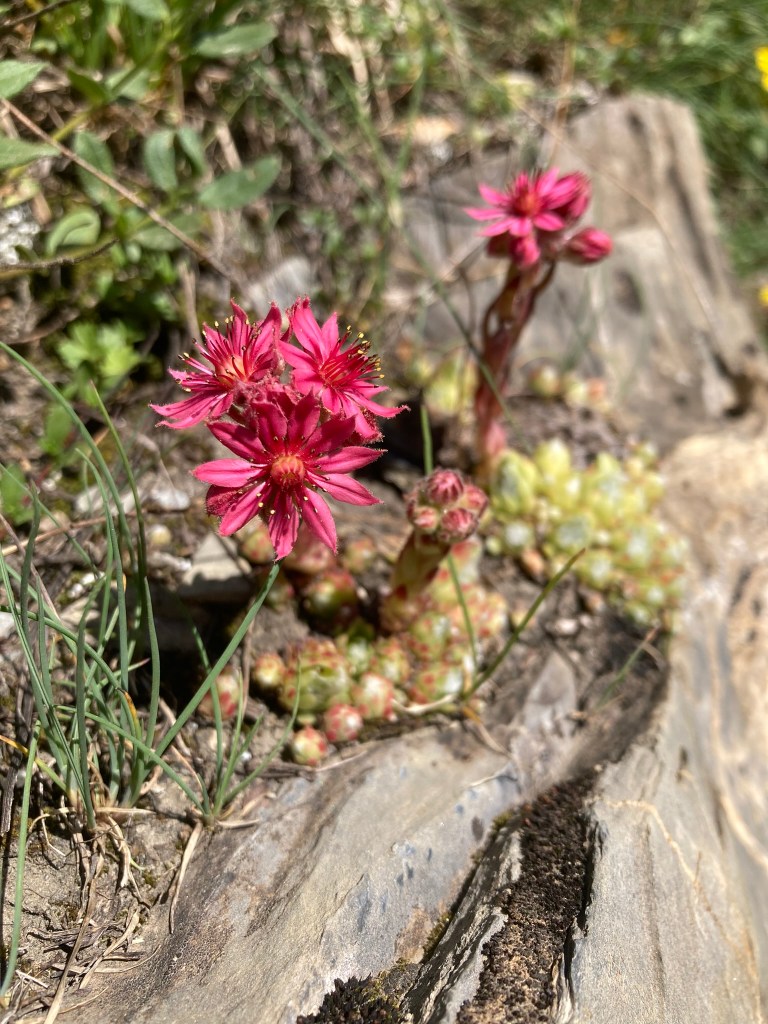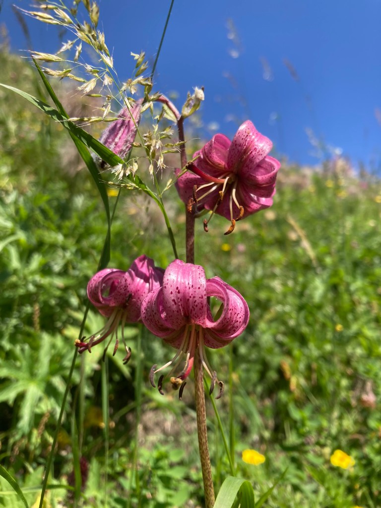 It’s not as sharp as some of the other descents we’ve experienced, but it is still rather exposed and therefore tiring. The trail largely follows a dirt road, along which we find wild strawberries and an assortment of flowers we’ve not seen before.
