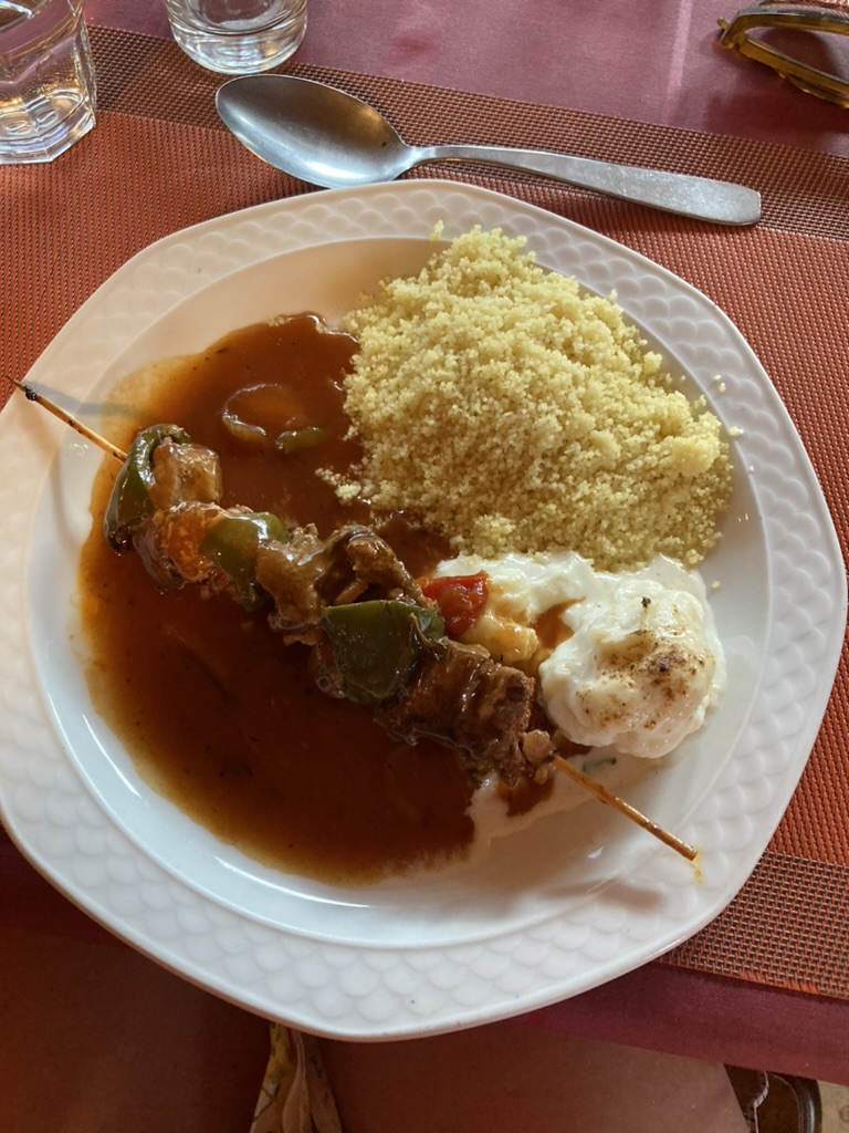 After this we return to the hostel and go outside and order a drink on the patio, then take it inside for dinner when it’s time. We have assigned seating again, and we end up with Mert, from Turkey, and Jeanne and George, from Oregon. It is an exceedingly pleasant evening chatting with them and eating the dinner, which is probably the best we’ve had so far in a refuge. There’s a soup first, then a salad (Vegetables! My body rejoices!), followed by a kebab with couscous and cauliflower covered in a creamy sauce. Grace’s vegetarian meal also looks incredible: in addition to the cauliflower and couscous, she gets an assortment of grilled vegetables. For dessert, there is gelato with a little cookie. I mean. Just. Chef’s kiss. Perfection. Parfait.