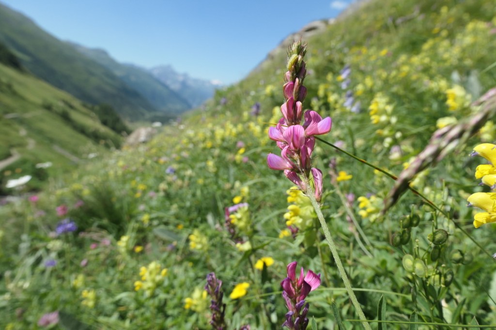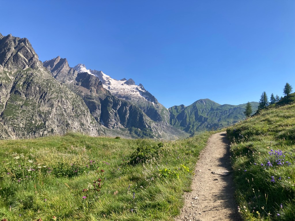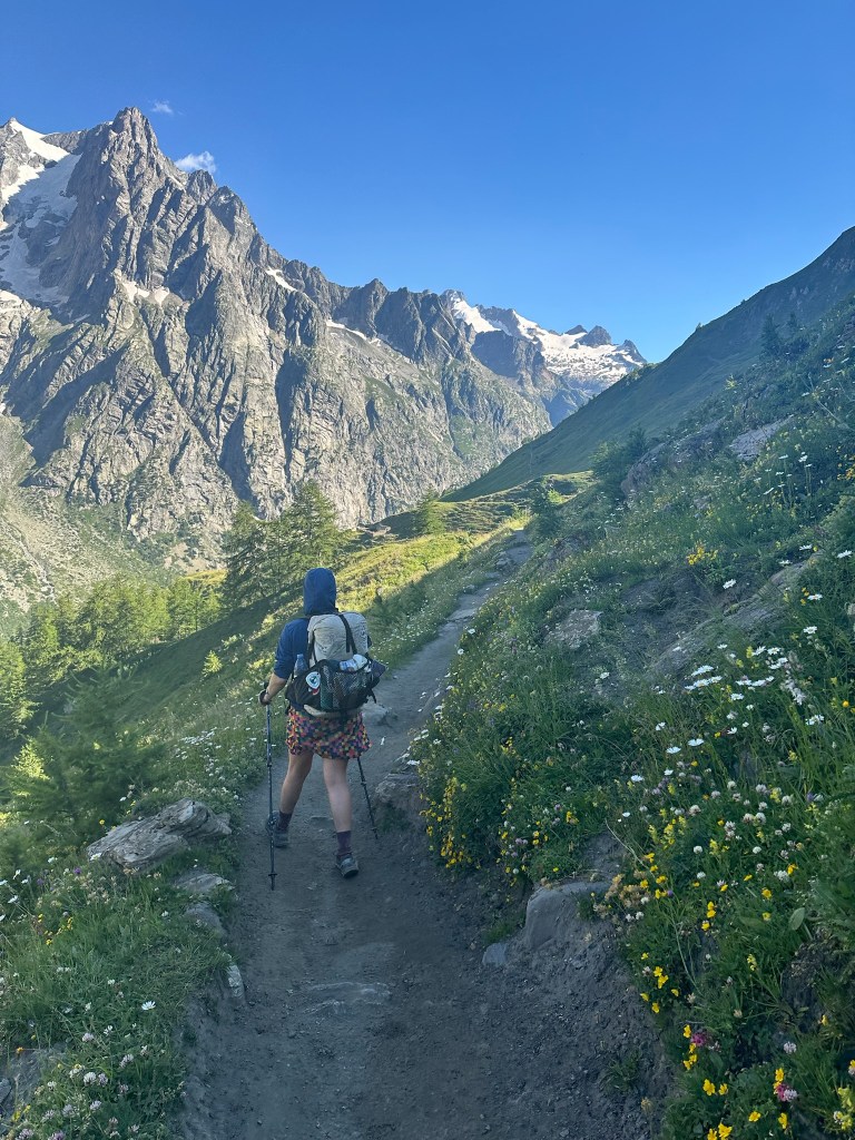 We make our way down to the valley, have a snack of leftover pizza to fuel up, and then start working on the climb up to Rifugio Elena, which is halfway up the climb to Grand Col Ferret, the Swiss border. It’s tough, but not terrible, and the wildflowers are absolutely popping on either side of the trail, even more than I’ve seen so far. I take photo after photo during my little breathing stops.