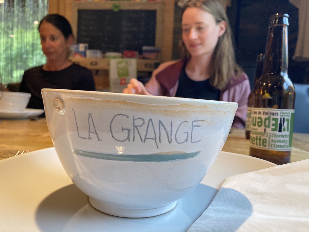 We have about a mile left to our refuge, and we decide to get up and get there. We walk through the small town, up a hill, and down and around a bend until we see the sign for Chalet La Grange, nestled deep in a green valley below the mountains. It’s a renovated old building, with that look of age on the outside but, once we get closer, the clear trappings of modernity: a huge open kitchen, big glass doors and windows, light wood.