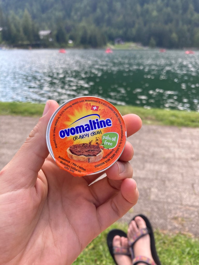 We take a break in the shade on the side of a gravel road. I eat a cake I bought in the supermarket last night, which Google Translate really struggles with and can’t seem to figure out. It’s some sort of chewy baked good which tastes vaguely of apple. The label is really cute, so I save it. Hooray for mystery Swiss snacks!