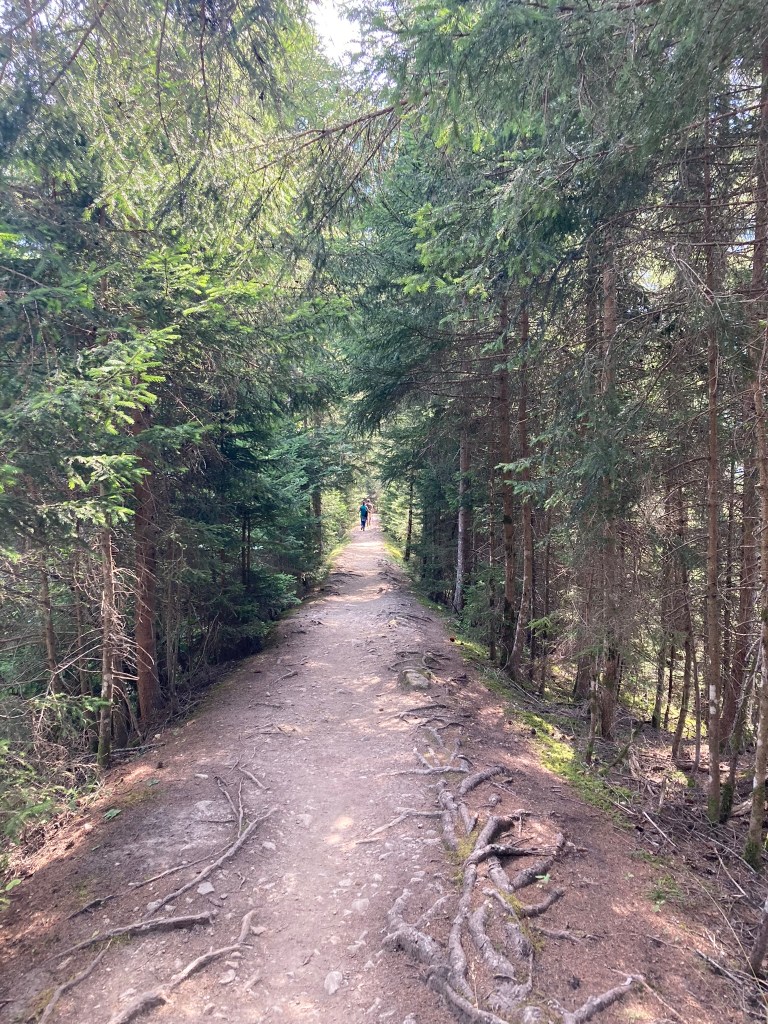 We reach the bottom of the gentle descent and take a seat on the covered outdoor patio of the only restaurant in town. I’m suddenly so hot and out of it even though the day hasn’t been that difficult. We both order sandwiches and sodas, which we eventually get, and finish, and pay, and then head up the ascent to Champex-Lac.